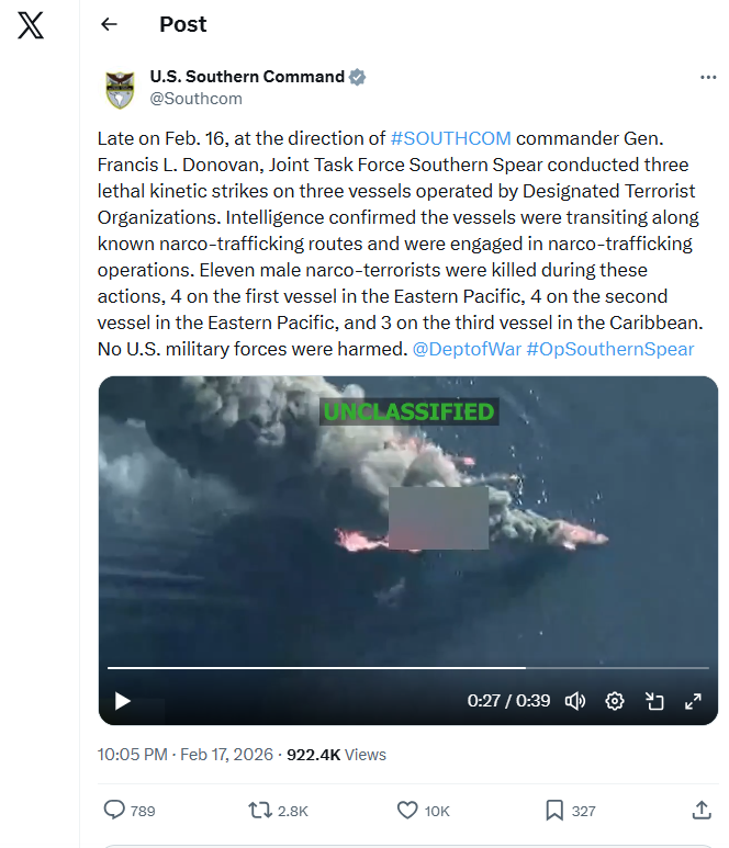 চলতি সপ্তাহের শুরুতে সাউথকম জানিয়েছিল, প্রশান্ত ও ক্যারিবীয় অঞ্চলে তারা তিনটি জাহাজে হামলা চালিয়েছে, যাতে মোট ১১ জন নিহত হয়েছেন।