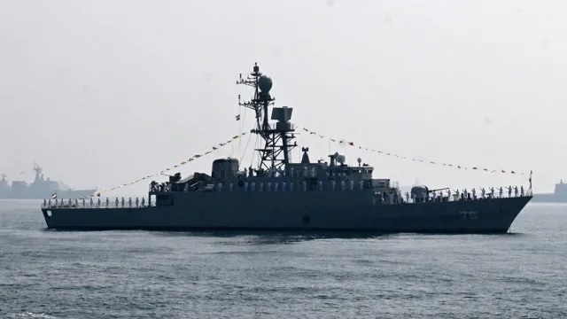ভারতের সঙ্গে যৌথ নৌ-মহড়া চলাকালে বঙ্গোপসাগরে ভাসমান ইরানি যুদ্ধজাহাজ ‘আইআরআইএস ডেনা’। ছবি: এপির সৌজন্যে