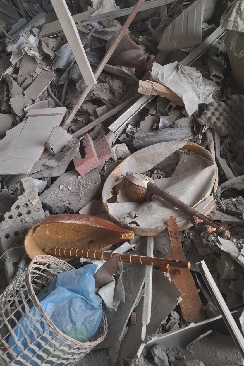 ধ্বংসস্তূপের মাঝে ছড়িয়ে ছিল ভাঙা গিটারের অংশ, লুটের (এক ধরনের বাদ্যযন্ত্র) ছিন্নভিন্ন কাঠামো, যেন কোনো এক সময়ের স্মৃতি।