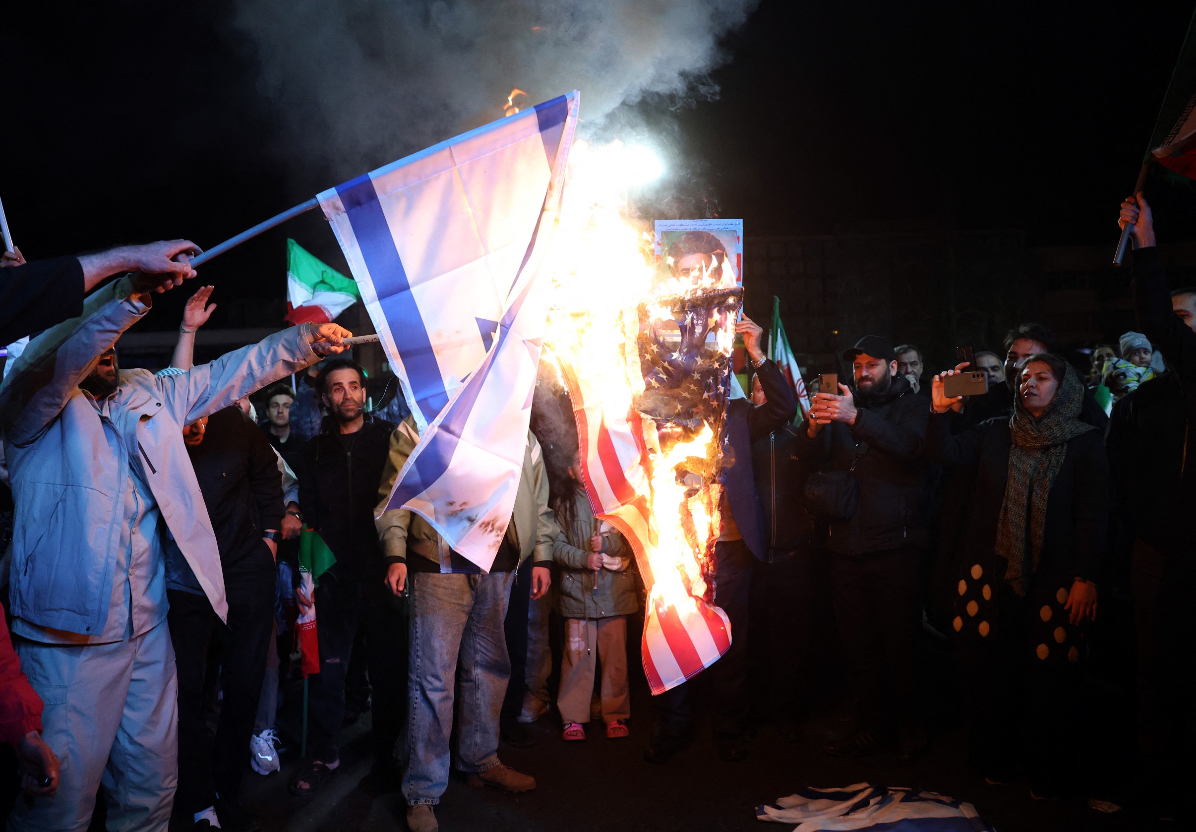 তেহরানের ইনকিলাব স্কয়ারে যুক্তরাষ্ট্র ও ইসরায়েলের পতাকায় আগুন দিচ্ছেন ইরানিরা। ছবি: এএফপি