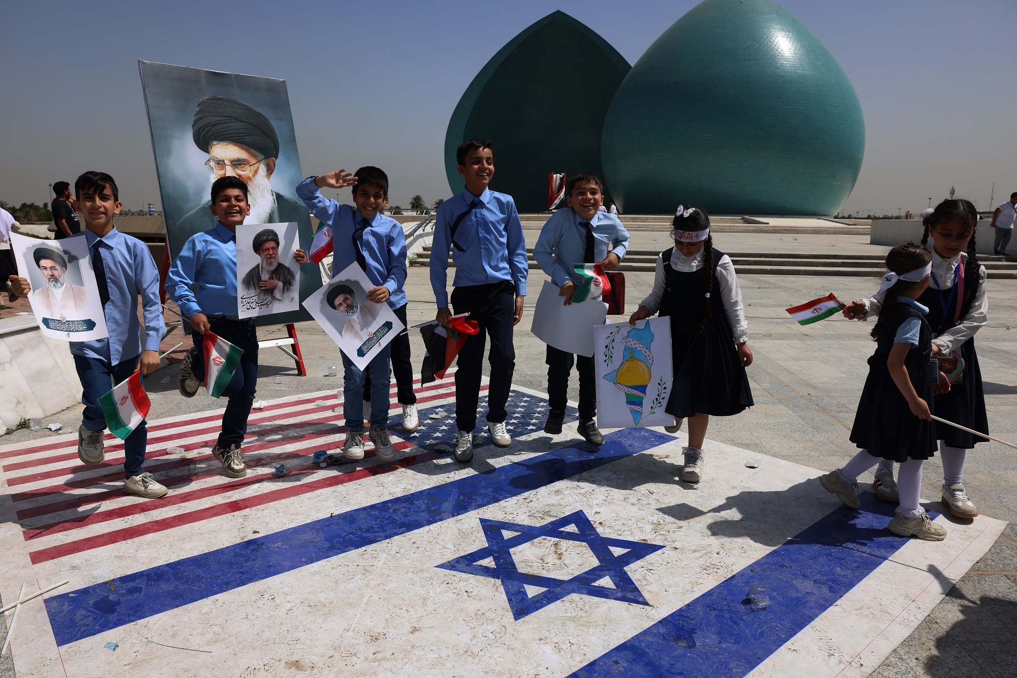 বাগদাদে বিক্ষোভে অংশ নেওয়া ইরাকের স্কুলশিক্ষার্থীদের যুক্তরাষ্ট্র ও ইসরায়েলের পতাকার ওপর দাঁড়িয়ে খেলতে দেখা যায়। ছবি: এএফপি