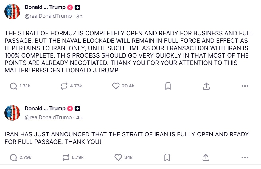 ইরানের পররাষ্ট্রমন্ত্রী আব্বাস আরাঘচি সামাজিক যোগাযোগমাধ্যম এক্সে হরমুজ প্রণালি পুরোপুরি খুলে দেওয়ার ঘোষণার পর মার্কিন প্রেসিডেন্ট ডোনাল্ড ট্রাম্প তার নিজ সামাজিক যোগাযোগমাধ্যম ট্রুথ সোশ্যালে একের পর এক পোস্ট দিয়ে যাচ্ছেন।
