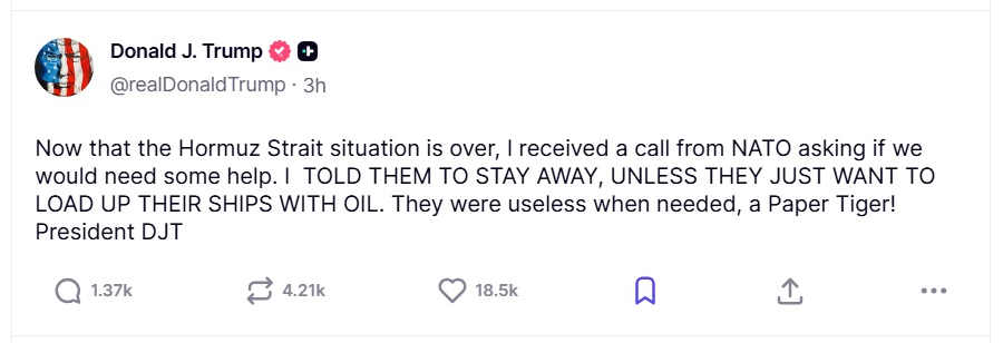 প্রতিক্রিয়ায় তিনি লিখেছেন, ‘হরমুজ পরিস্থিতি ঠিক হওয়ার পর ন্যাটো আমাকে ফোন করে জানতে চেয়েছিল কোনো সাহায্যের প্রয়োজন আছে কি না। আমি তাদের বলেছি দূরে থাকতে, যদি না তারা শুধু তাদের জাহাজগুলোতে তেল ভরতে চায়। প্রয়োজনের সময় তারা ছিল ‘কাগুজে বাঘ’।’