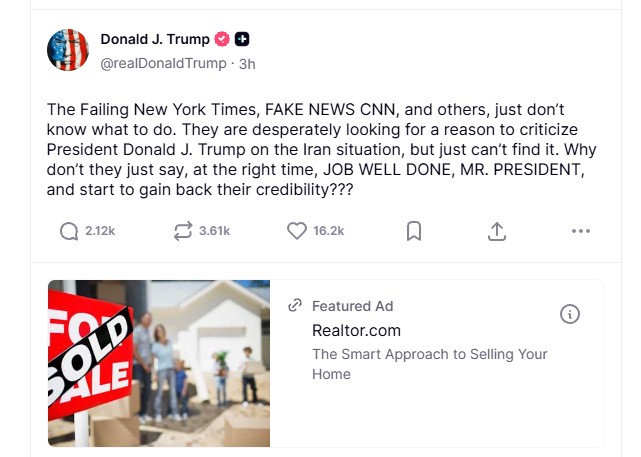 এ বিষয়ে পোস্টে লিখেছেন, ‘ব্যর্থ নিউইয়র্ক টাইমস, ফেক নিউজ সিএনএন এখন কী করবে বুঝতে পারছে না। তারা মরিয়া হয়ে আমাকে সমালোচনা করার সুযোগ খুঁজছে, কিন্তু পাচ্ছে না। তারা কেন বলে দিচ্ছে না—জব ওয়েল ডান, মি. প্রেসিডেন্ট।’