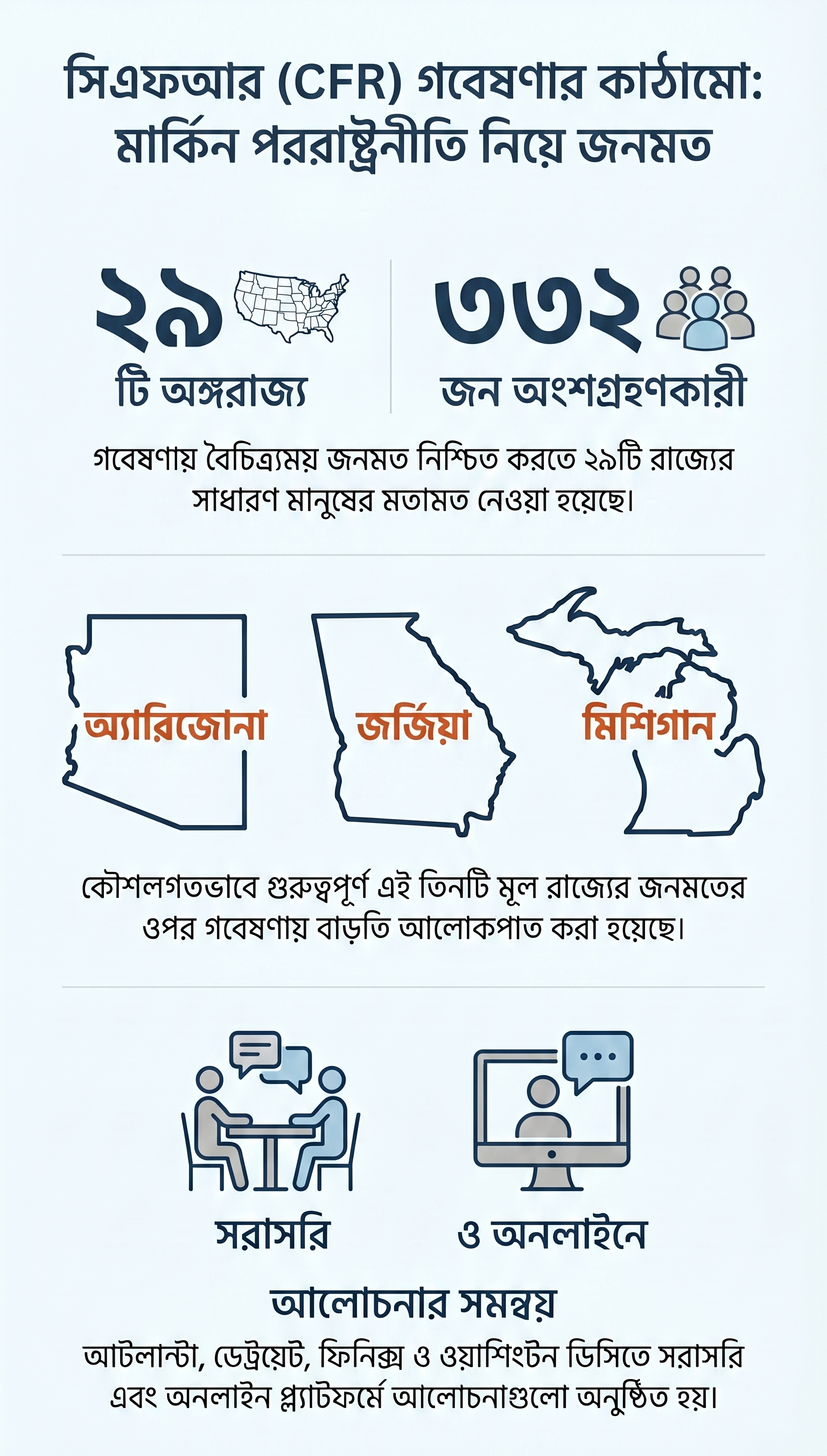 কাউন্সিল অন ফরেন রিলেশনস (সিএফআর) ২০২৫ সালের শেষদিকে ২৯টি অঙ্গরাজ্যের ৩৩২ জন সাধারণ মানুষের সঙ্গে ধারাবাহিকভাবে কথা বলে। অ্যারিজোনা, জর্জিয়া ও মিশিগান—এই তিন রাজ্যের ওপর বেশি গুরুত্ব দেওয়া হয়। অংশগ্রহণকারীরা আটলান্টা, ডেট্রয়েট, ফিনিক্স ও ওয়াশিংটন ডিসিতে সরাসরি এবং অনলাইনে এসব আলোচনায় যুক্ত হন। এই আলোচনা ও বিভিন্ন জরিপের তথ্য দিয়ে মূল প্রশ্নটির উত্তর খোঁজার চেষ্টা করা হয়েছে।