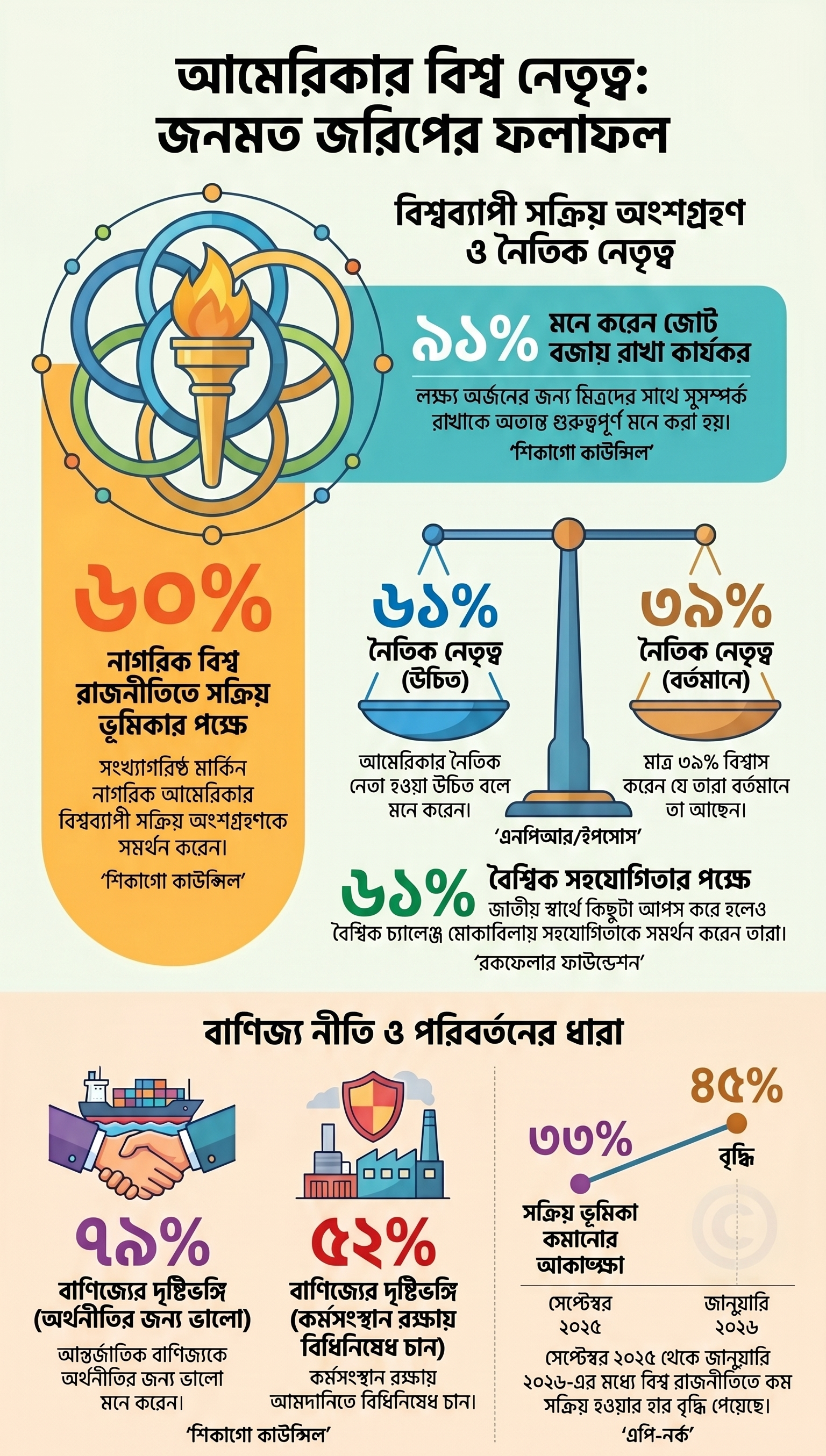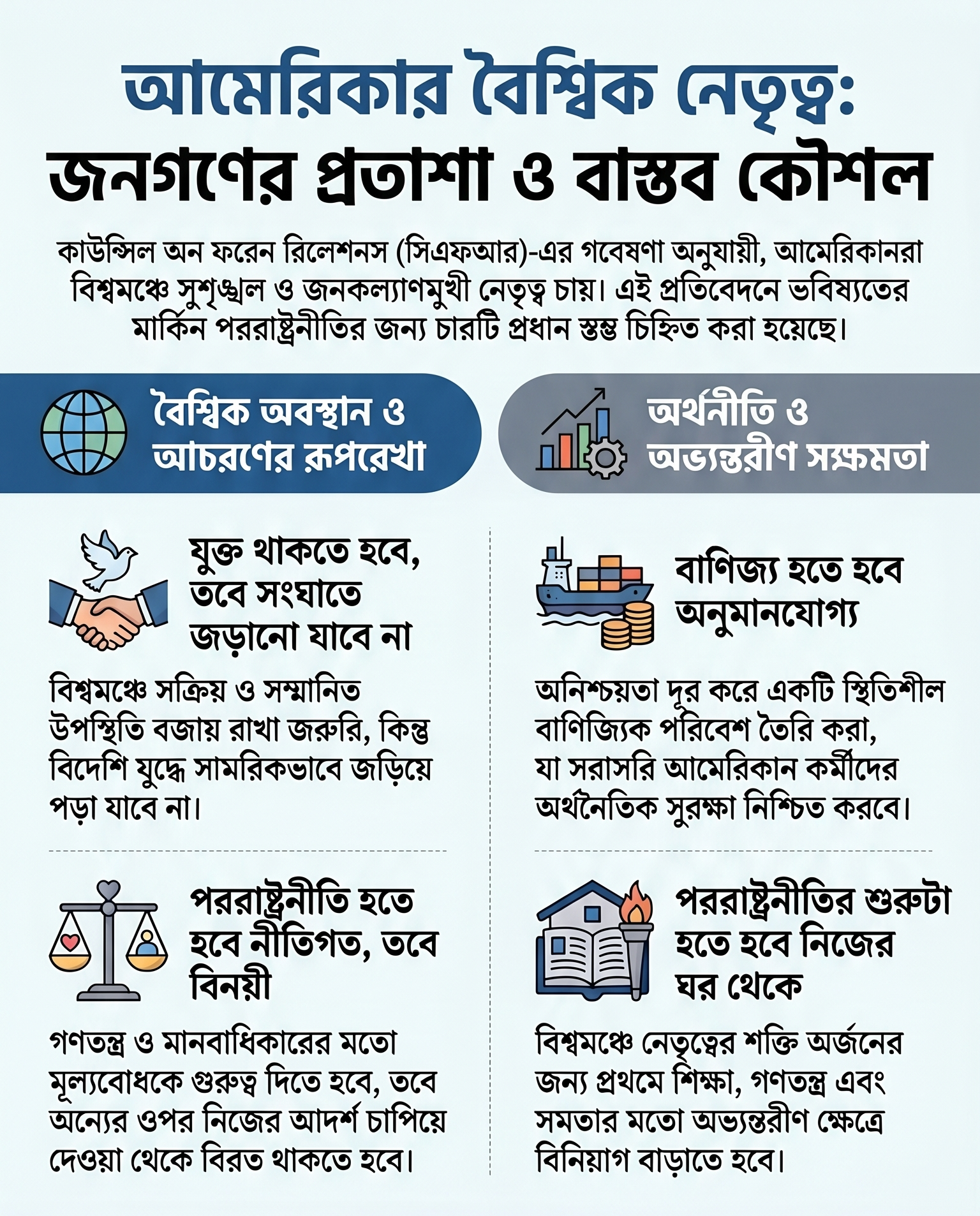 সব মিলিয়ে, মার্কিনিরা বৈশ্বিক নেতৃত্বের পক্ষে থাকলেও তারা চান সেই নেতৃত্ব হোক সংযত, বাস্তবমুখী এবং দেশের মানুষের জীবন-জীবিকার সঙ্গে সরাসরি সম্পৃক্ত।