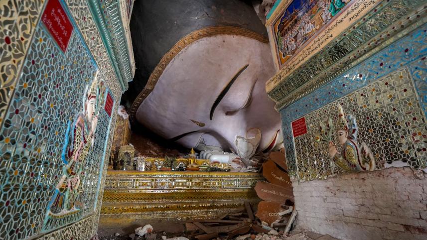 ৩ এপ্রিল, মিয়ানমারের মান্দালয়ে ভূমিকম্পের পর একটি প্যাগোডার ভেতরে ক্ষতিগ্রস্ত অবস্থায় পড়ে থাকা একটি বৌদ্ধ মূর্তির ছবি। ছবি: রয়টার্স