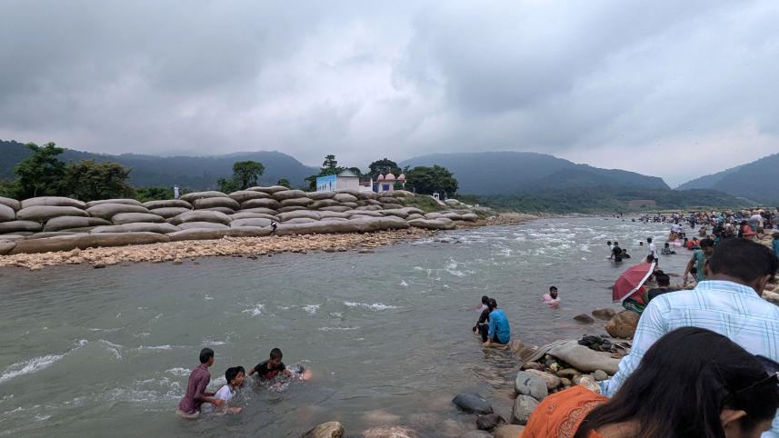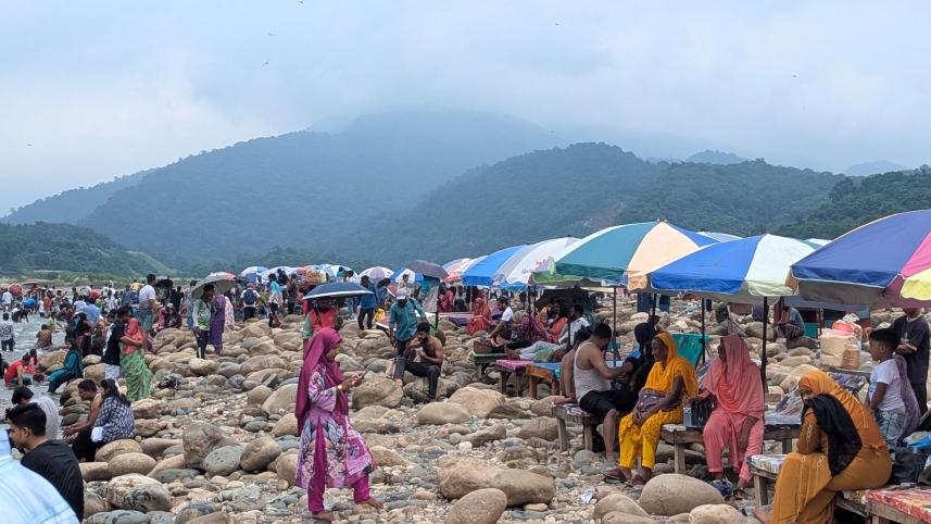 প্রশাসনের উদ্যোগে লুট বন্ধ এবং পাথর ফিরিয়ে দেওয়ার পর দর্শনার্থীদের পদচারণায় আবারও মুখর হয়ে উঠতে শুরু করেছে সিলেটের সাদাপাথর। এই পর্যটনকেন্দ্রটি সিলেটের সীমান্তঘেঁষা কোম্পানীগঞ্জ উপজেলার ভোলাগঞ্জে, বাংলাদেশ-ভারত সীমান্তের শূন্যরেখার কাছে অবস্থিত। সীমান্তের ওপারে ভারত অংশে সবুজ আচ্ছাদিত সারি সারি পাহাড় থেকে কলকল শব্দে পানি এপারে ধলাই নদে মিশে সৃষ্টি হয়েছে এক নৈসর্গিক প্রাকৃতিক সৌন্দর্যের। ছবি তুলেছেন দ্য ডেইলি স্টারের আলোকচিত্রী শেখ নাসির।